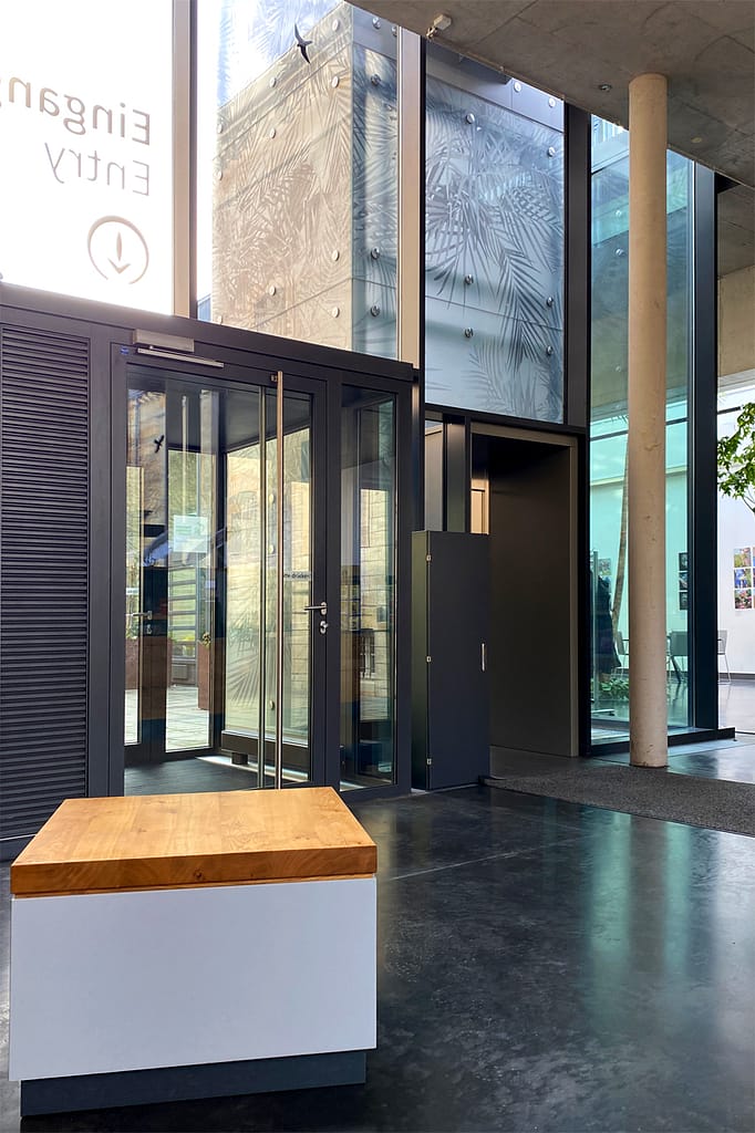 Sicht- und Bewegungsachse, entlang der Wasserachse vom Gelände der ega auf der westlichen Gebäudeseite. Der Zugang für ega-Besucher war bisher nicht optimal geregelt und nur über eine Treppenanlage erreichbar. Durch die Umstrukturierung der Außenanlagen wurde eine Achse geschaffen, welche die Eingangsituation der Westseite neu ausbildet und somit einen Zugang zum neuen Aufzug verschafft.